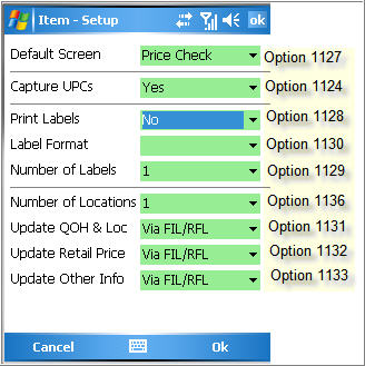 As desired, change any of the settings on the Item Setup screen by clicking the down-arrow and making your selection. For more information about a particular field, see the table in the Set Up Options topic. In the image below, the corresponding option number in Options Configuration is indicated to the right of each field.