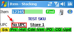 With the item displayed, tap the underlined field to the right of UPC (the field reads No UPC if no UPCs are yet on file for the item).