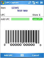 With the item displayed, tap the underlined field to the right of UPC (the field reads No UPC if no UPCs are yet on file for the item).