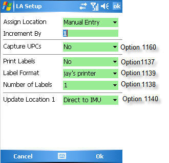 Increment Location (If you select this option, you must also enter a number in the Increment By field). Every time you scan or enter a subsequent item, Location 1 of the prior item is automatically incremented by the number you specified in the Increment By field. Note: using the increment feature only applies to numeric location codes, not alphanumeric codes.