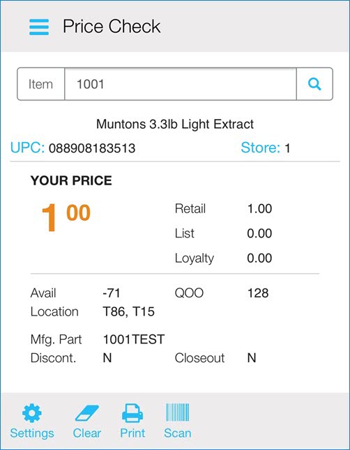 In the Price Check screen, display an item by scanning the item's barcode, typing the item's SKU number, or entering the item's UPC code.