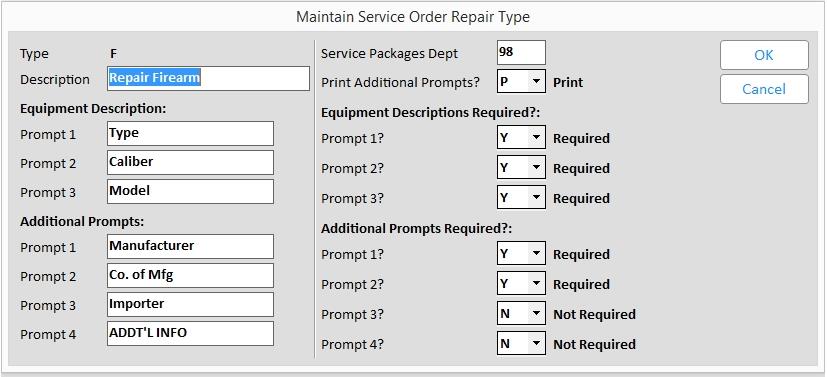 ID# 1759 “Service Orders - using multiple Repair Types?”. This option must be set to Yes. At POS stations where firearms are accepted for repair, that station’s Option 1755 “Service Order - Repair Types which can be created at this POS station” must include F for Firearms.