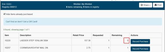 Use the Record Purchase button for indicating the item was purchased outside of the store (Registrant/consumer).