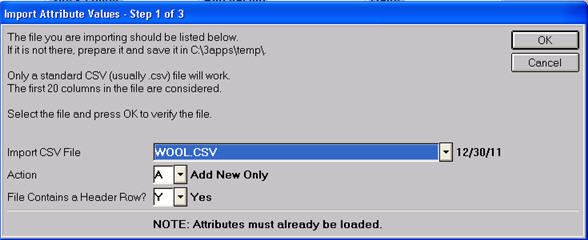 A list of attribute values (Red, Blue White etc.) can be imported into Attribute Value Maintenance from a CSV file.