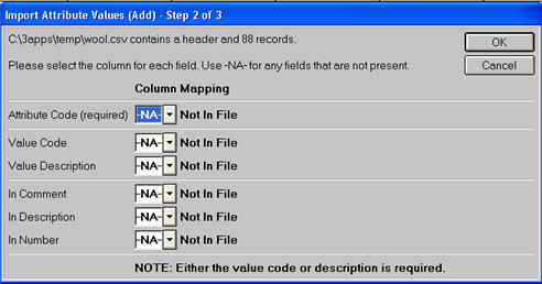 Create a CSV file containing the following columns of information: Attribute Code (the attribute for which you are adding values-- A1, A2, etc.), Value Code, Value Description, and Comment.