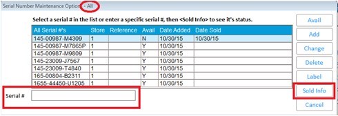 Note: By default, the list displays only "available" (unsold) serial numbers. To display both sold and available serial numbers, click All.