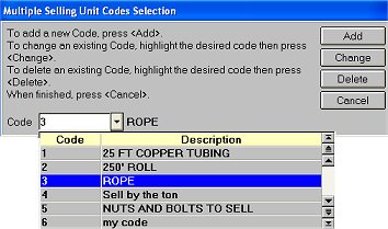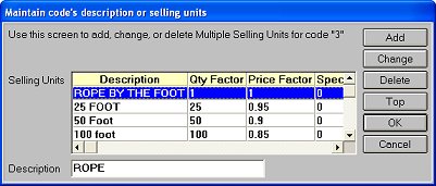 To modify a selling unit, click on it, click change, make your modifications in the dialog that displays, and click OK. Then click Cancel twice to exit.
