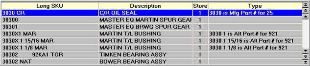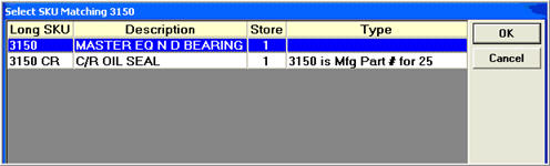 Item searches include manufacture part number and/or vendor alternate part number, whether you're performing a "matches" lookup (you type in the value in the SKU field, and press Enter) or a typematic lookup (you type in a starting value in the SKU field and press Page Down). If you set up your system to include Manufacture Part Number and/or Vendor Alternate Part Number in SKU lookups and typematic searches (option 2509 and/or option 2511 are set to Yes), the system takes your search criteria and finds SKU, Manufacture Part, and Vendor Alternate Part matches. Click here for examples.