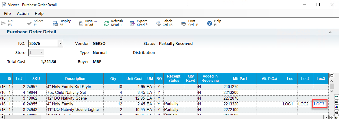 You can view all 6 Locations for an item either in the Location Codes dialog or in the viewer grid. To open the Location Codes dialog, click on the Loc 3 hyperlink available in the viewer grid.