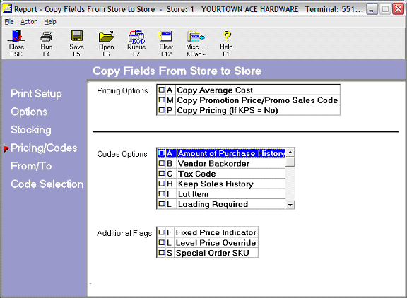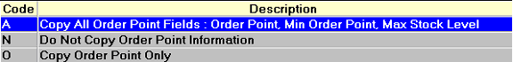 In the Codes Options field, you will see some of the store specific fields found on the Inventory Maintenance window Codes tab. You can select the following fields to copy:
