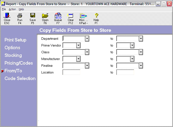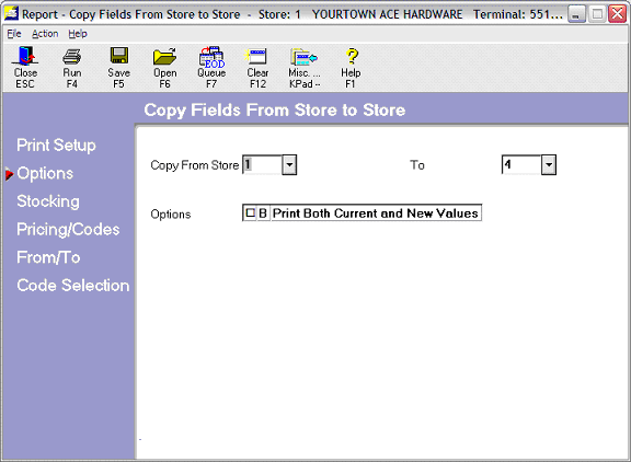 Note: If you keep your prices the same across all stores, then option P, Copy Pricing, will have no effect. You need to be careful when using option M, Copy Promotion Price/Promo Sales Code. Using this option will copy any promotional price from Inventory Maintenance and the promo sales code if the item is on an active promotion. In this case the “To” store will not have a promotion to activate or deactivate, so all of the items copied using this option are considered on a permanent promotion.