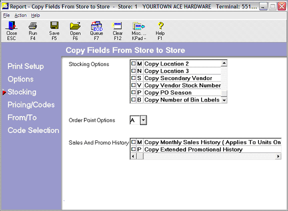 Another example would be if you added a new store and want to copy store 1 to the new store, but think that store 3’s order points would be a better fit. You can use the Copyrecs application to copy store 1 to the new store, then use the Copyfields application to copy the sales history and order points from store 3 to the new store.