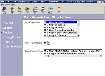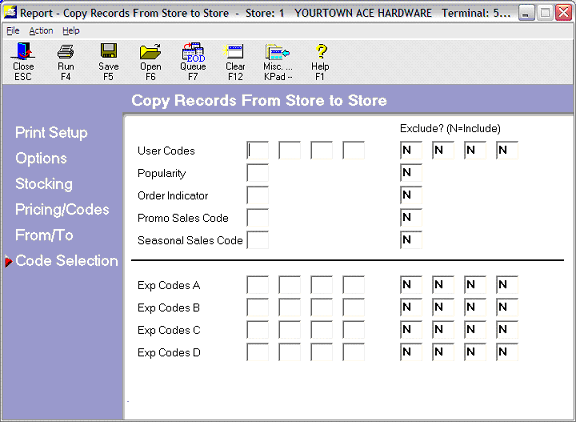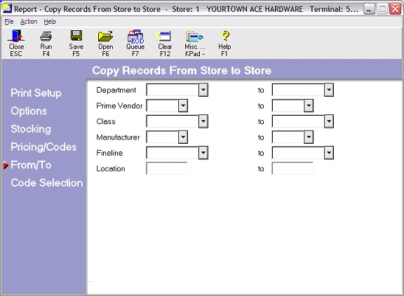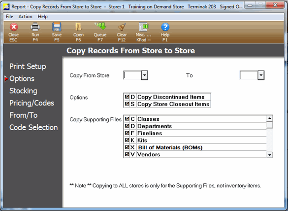 Note: Running COPYRECS to copy supporting files will also copy the inventory items in the ‘from’ store to the ‘to’ store. So, be sure to use the proper from/to’s and code exclusions as necessary.