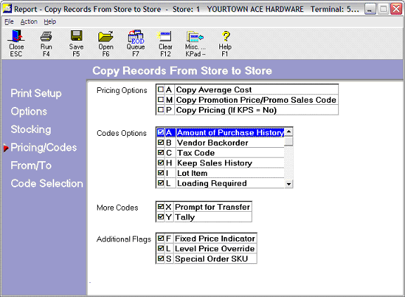 In the Codes Options field, you will see some of the store specific fields found on the Inventory Maintenance window Codes tab. You can select the following fields to copy: