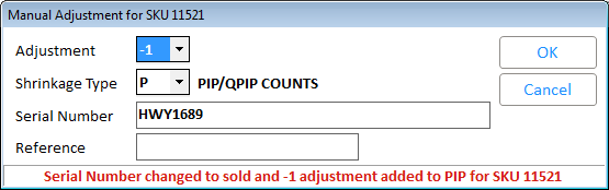 Set Adjustment to -1 to change the Status from Available to Sold for that serial number and remove it from inventory. This applies to serial numbers with Status = Available but was already sold and you want to remove it from inventory.