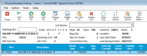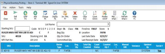 This procedure requires security bit 423 "Add/Change/Delete physical inventory counts" set to Yes.