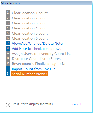 If option 3074 is Yes and 8990 is Yes (for multi-store users), adding an item with the Tally=S (Serialized item) into the Add dialog will add the SKU into PIP ignoring any count entered. After all SKUs have been added, press Cancel to close the dialog. The notification message will display to inform you of how many serialized items were added to PIP and to use the Serial Number Viewer (SNV) to enter counts.