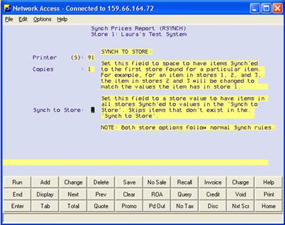 Note that if an item doesn't exist in the store you enter in the Synch to Store field, that item is skipped over (costs/prices are unaffected) in any stores in which the item does exist. Additionally, as mentioned earlier, RSYNCH only affects items in other stores that have the "Synchronize Prices" and/or "Synchronize Costs" fields set to Y in Inventory Maintenance.