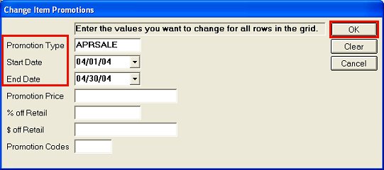 In the Change Item Promotions dialog box that displays, enter the Promotion Type, Start Date, and End Date.