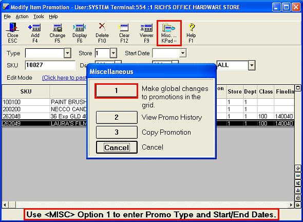 In the Modify Item Promotion window— where the message "Use <MISC> Option 1 to enter Promo Type and Start/End Dates" is displayed— click Misc, then select "Make global changes to promotions in the grid."