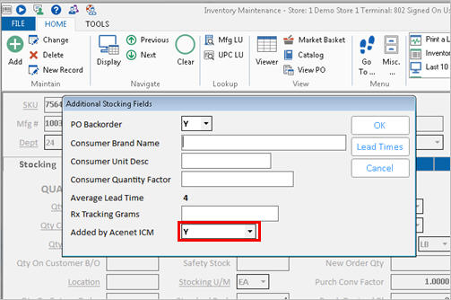 To display this field, click the Additional Stocking Fields hyperlink on the Stocking tab of Inventory Maintenance. This field is for Ace retailers using the Ace Replacement Item Maintenance program (option 9971 "Use Ace Replacement Item Maintenance process?" is set to Yes), Acenet flags replacement items in Inventory Maintenance as "Added by Acenet ICM." This field is store specific. It contains Y if the item was added by Acenet; otherwise it will be blank. When the Suggested Order Report (RSO) generates an order for the replacement item for the first time, the canceled item's sales history is copied to the replacement item for any months since the replacement item was added (current month's history is not copied.)