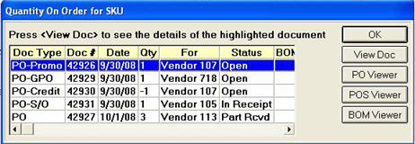 To view POs and Transfers containing this item, use the down-arrow to highlight the appropriate document and press View Doc.