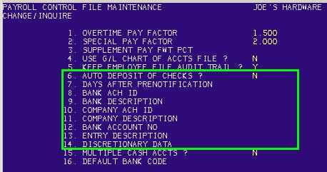 This job aid describes how to set up your system for payroll direct deposit transactions. The setup includes entering information in the Payroll Control File (PCON) and banking information in the employee record (PEMU) Important: To use this feature, an Epicor representative must change option 3092 "Standard Direct Deposit Format" to Yes in Options Configuration. |