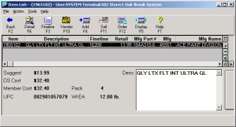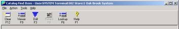 The catalog is a database of all items carried in the vendor's warehouse. These items are not necessarily in your inventory file. You may look up specific items in the catalog and then choose to complete several tasks. For example, you may add an item to your inventory files if it is not already there. The catalog is updated on a regular basis. |
