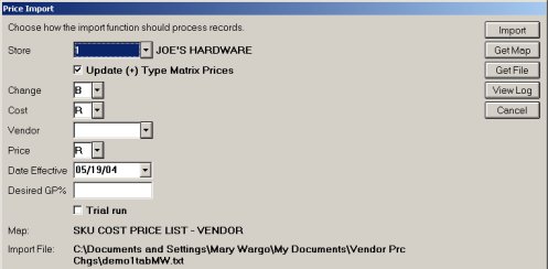 The Price Import window There are two ways to display the Price Import window: 1) from the Price Import Designer window click the Import button, and 2) display the window directly from the Eagle Browser menu. The window is basically the same, except Method 2 includes two additional buttons, Get Map and Get File. Select Method 2 if you already have a map file saved that you can use with the data file. If you do not have a map file saved, you must use Method 1 to first map the data file. Refer to online help or the Price Import Designer job aid for more information. An example of the window, opened from the Browser menu.