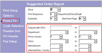 From the Suggested Order Report (RSO), click Options, and select an Order Calc Option based on the desired vendor (V= Primary, M=Manufacturer or I=Alternate Vendor). At Selection Options, select S, and at Other Options, select F.