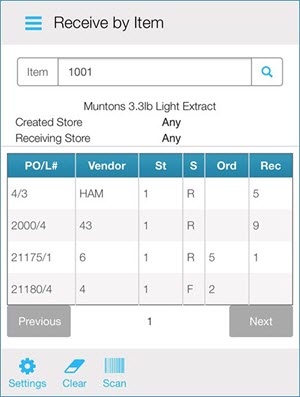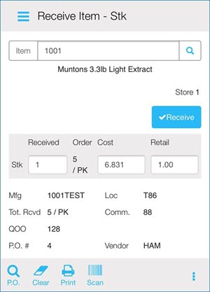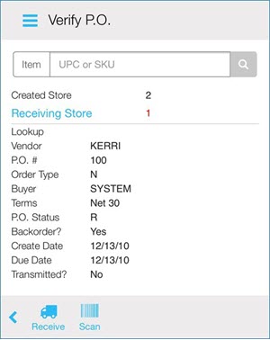 Once a batch is entered, the procedure is the same like when receiving by item. When you scan or enter an item number, and any PO in the batch that has that item on it, the item displays. If only one PO with that item exists, you are taken directly to the Receive Item screen.