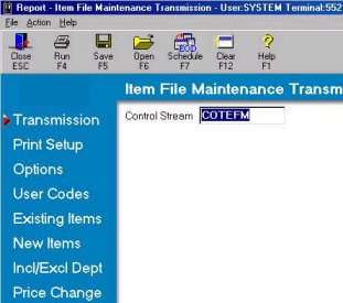 Finalize file maintenance changes File maintenance records received with an EFM transmission are available for review (change or delete) in the Flexible Inventory Load (FIL) window. Use the Flex Name COTEFM to review changes to items that already exist in your Inventory file. Use the Flex Name COTNEW to review the new items not yet in your Inventory file. As you review items, you can make changes to the fields that display in COTEFM or COTNEW. Locate the item in the grid, click the field you want to change, type the new information, and click <Change>. Use the Flexible Inventory Loading Report (RFL) to print an edit list of the items in COTNEW or COTEFM. When you are ready to finalize the changes, run the RFL report with Options FXY to finalize and move the updates to your Inventory file. |