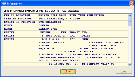 LaserCat 3 provides two types of VIN information. If you performed a lookup using a method other than using an actual VIN, you can press <F4> or press the V.I. Button on the Lookup window to see VIN information.
