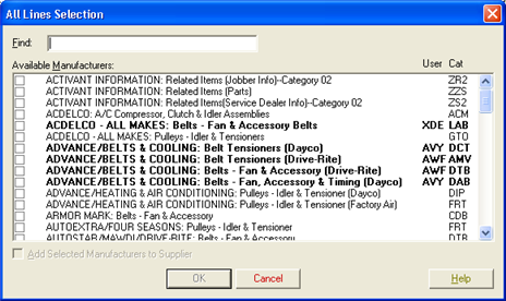 This dialog lists all the coverages (parts lines) not included in your current supplier's MCL that are valid for the current lookup. The coverages shown contain parts that meet the criteria of your lookup. See Using All Lines to Refine a Lookup to see how to use this dialog.
