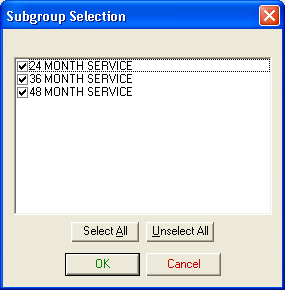 The Subgroup Selection dialog box displays during a LaborExpert or ServicePlus lookup if the vehicle manufacturer has monthly service requirements in addition to regular mileage services.