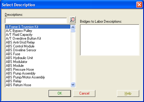 See Selecting Part and Labor Catalog Descriptions for information on using this dialog.
