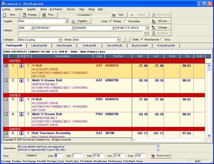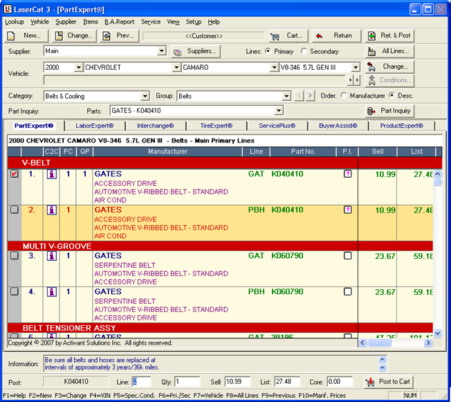 After you perform a lookup in PartExpert, the results display on the main LaserCat 3 window. You can manipulate your lookup in various ways to find a part from the lookup results. For example, you can: