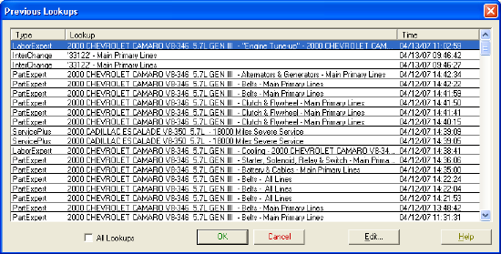 Use this dialog to repeat a lookup for a previous vehicle. This dialog displays a list of lookups from the previous five days.