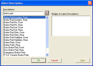 To set up a job, select the required parts and labor items used in LaserCat and send them to your integrating application. Your integrating application will allow you to access dialog boxes for selecting descriptions of groups, part and labor categories, and tire sizes.