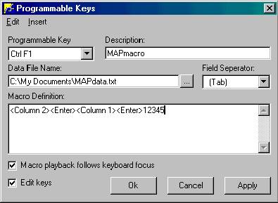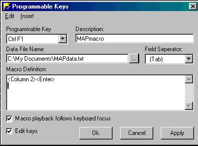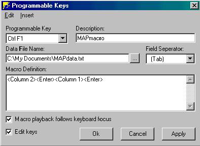 The next step is the "Macro Definition". This step can be somewhat tricky and some experimenting may be necessary to make the macro do what you intend. IMPORTANT- Along the top of the Programmable Keys window there is a short menu bar. This menu bar has only two choices, Edit & Insert. In this example, the first keystrokes you would make on the MAP screen would be typing an alternate part number. Since the purpose of this macro is to eliminate keystrokes, this macro will take the data from your file and type it for you. Therefore, the first thing you want the macro to do is to take the data from the file and insert it into the field "alternate part #" of MAP. To program the macro to do this, click Insert on the menu bar, then click Data File Column. See below.