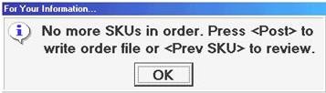 Repeat steps 8 and 9 until you have gone through all the items on the transaction. If you want to move back and forth through the items, you can click Previous or Next, as necessary. When you've reached the last item on the order, the following message displays: