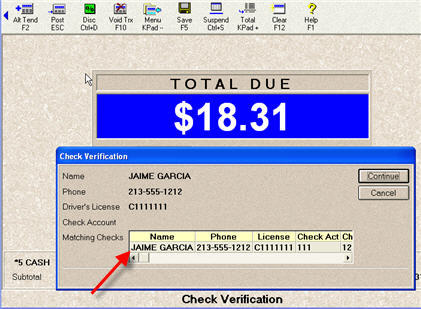 When you total the transaction and tender a check, you are presented with the Check Verification dialog. Fill in as much information as you have about the customer (name, phone number, driver's license number, etc.)