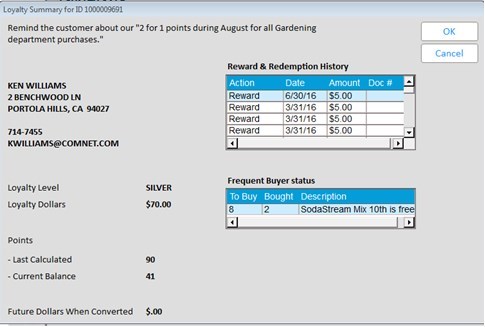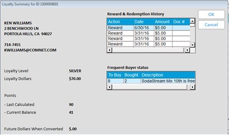 This loyalty summary window displays the customer’s name, address, phone number (dependent on option 9198), email (dependent on option 9199), loyalty level (dependent on option 9996), loyalty dollars and reward/redemption history (dependent on options 9067 & 9068 both being > 0), points information (dependent on option 9061), and Frequent Buyer promotion status (dependent on option 9811 "Punch Card Dynamic Promotions on System"=Yes).