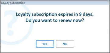 This is the dialog box that appears in POS when the loyalty customer has a subscription that will expire within # of days set in option 9869: