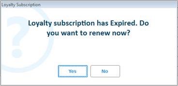 If this prompt is answered No, the loyalty customer is still eligible for ‘loyalty only’ pricing/promotions and their purchases will still accumulate. Since the membership has expired, those purchases are not converted to points (by CALCPNT) until their loyalty subscription has been renewed.