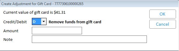 Click Adjust (F4). The Create Adjustment for Gift Card dialog displays.