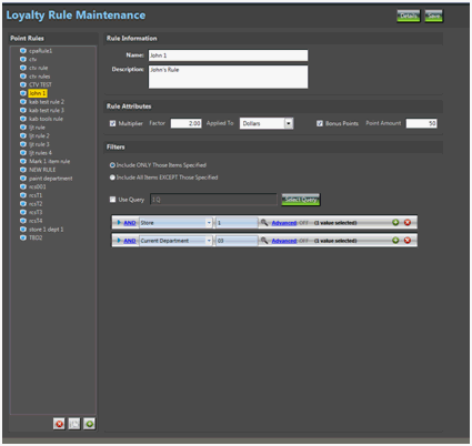Loyalty Rules define the loyalty point values to assign to items. The user can determine the multiplier and eligible bonus points to assign to the sales of any category of items. The item set is determined using the criteria entered in the Filter field on the Loyalty Rule Maintenance window. Examples of item sets can be Store, Department, Class, Fineline, Vendor, etc.