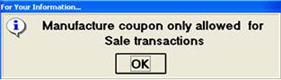 Scanning a manufacturer coupon on any other transaction type such as a Credit Memo or Order displays this message: