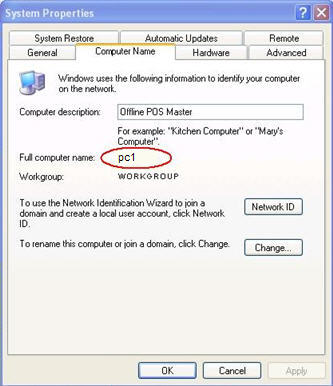 You must know the exact computer name of the Offline POS Master PC to which the Client will be associated. To obtain the name of the Master, right-click on the " My Computer” icon on the desktop of the Master PC, then click Properties. From the System Properties dialog box that displays, click the "Computer Name” tab.