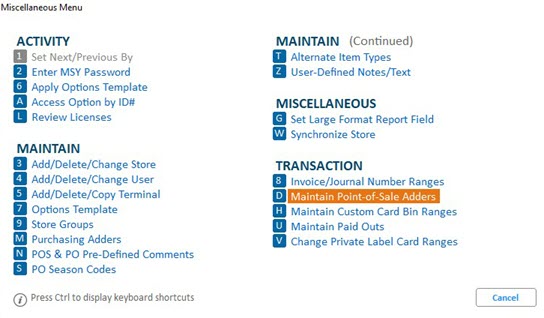From the Action menu, select Misc Procedures, and select D-Maintain Point-of-Sale Adders.
